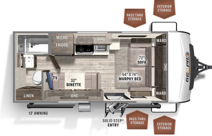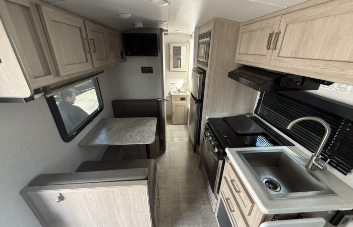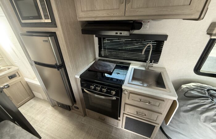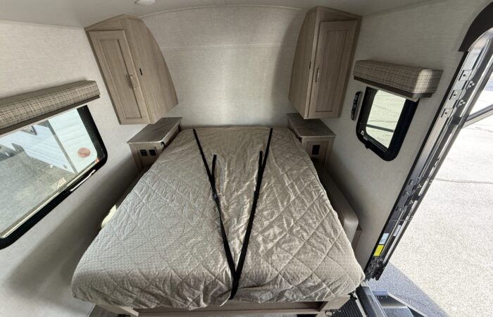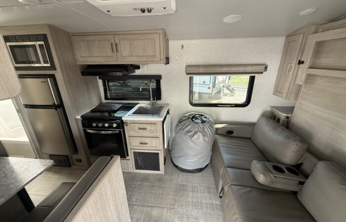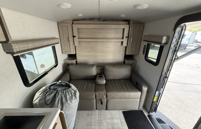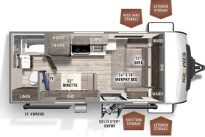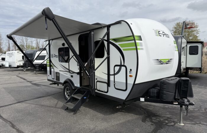 Super clean 2021 Flagstaff E-Pro 19FD! Only 3,159 lbs and fully equipped with solar, inverter, dual batteries for off-grid adventures! Full bath, new off-road tires, dual LP tanks, a winter cover, and best of all, all composite + aluminum construction! No wood to rot! On display now.